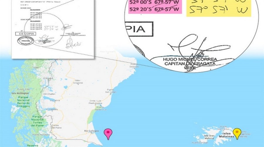 Si se busca en un mapa una de las dos coordenadas manuscritas, 52° 00\' S 57° 57\' W, el lugar indicado para que opere el submarino es la costa de la isla Soledad, en Malvinas, cerca de Puerto Argentino. Cuando se ingresa la otra: 52° 20\' S 57° 57\' W, la ubicación del ARA San Juan es tan solo unos 30 kilómetros más arriba, siempre en las cercanías de las Islas Malvinas. En tanto, las coordenadas impresas en el documento 52° 00\' S 67° 57\' W y 52° 20\' S 67° 57\' W, ubicaban al ARA San Juan cerca de Comodoro Rivadavia.