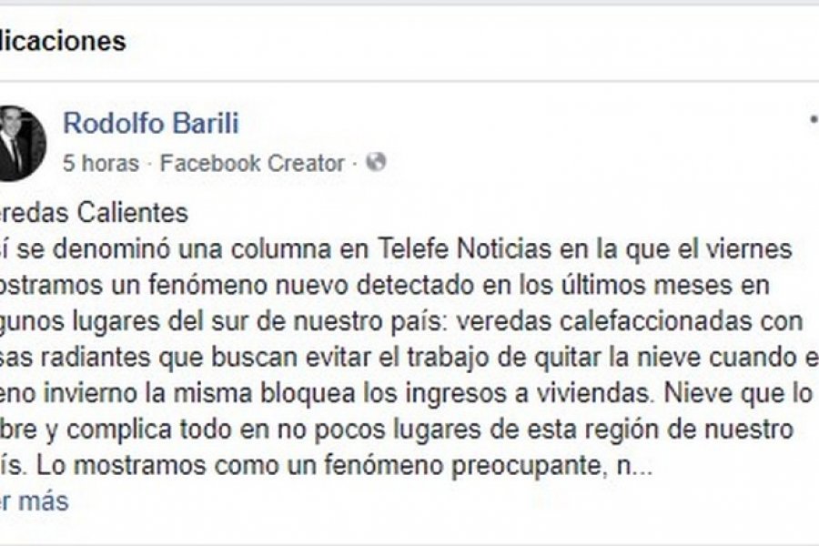 Veredas Calientes, Así se denominó una columna en Telefe Noticias en la que el viernes mostramos un fenómeno nuevo detectado en los últimos meses en algunos lugares del sur de nuestro país: veredas calefaccionadas con losas radiantes que buscan evitar el trabajo de quitar la nieve cuando en pleno invierno la misma bloquea los ingresos a viviendas. Nieve que lo cubre y complica todo en no pocos lugares de esta región de nuestro país. Lo mostramos como un fenómeno preocupante, nuevo y puntual. Con imágenes de viviendas donde el hecho fue detectado por las compañías de energía.