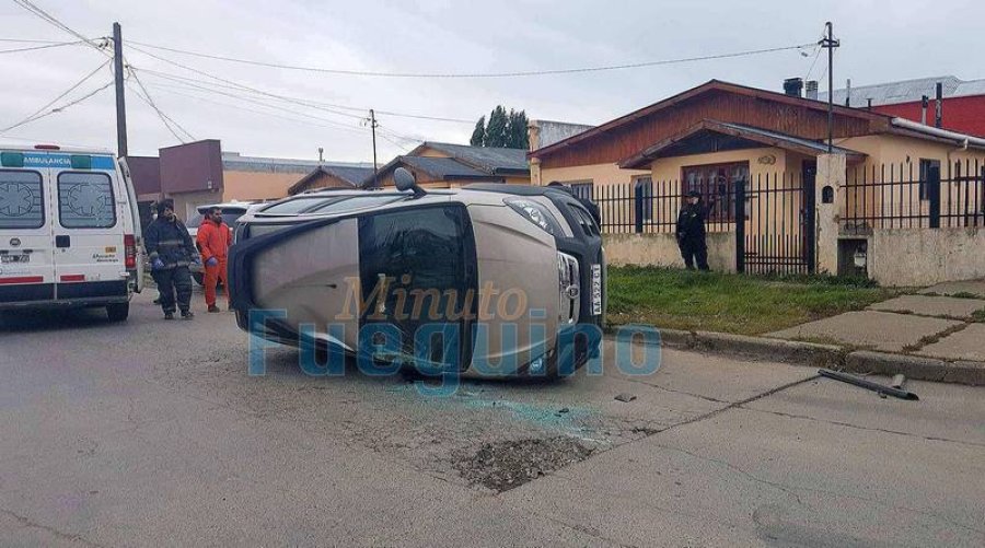Un fuerte choque se produjo hoy en Río Grande. Luego del impacto uno de los automóviles terminó sobre uno de sus laterales. Los dos conductores y un acompañante terminaron en el hospital.