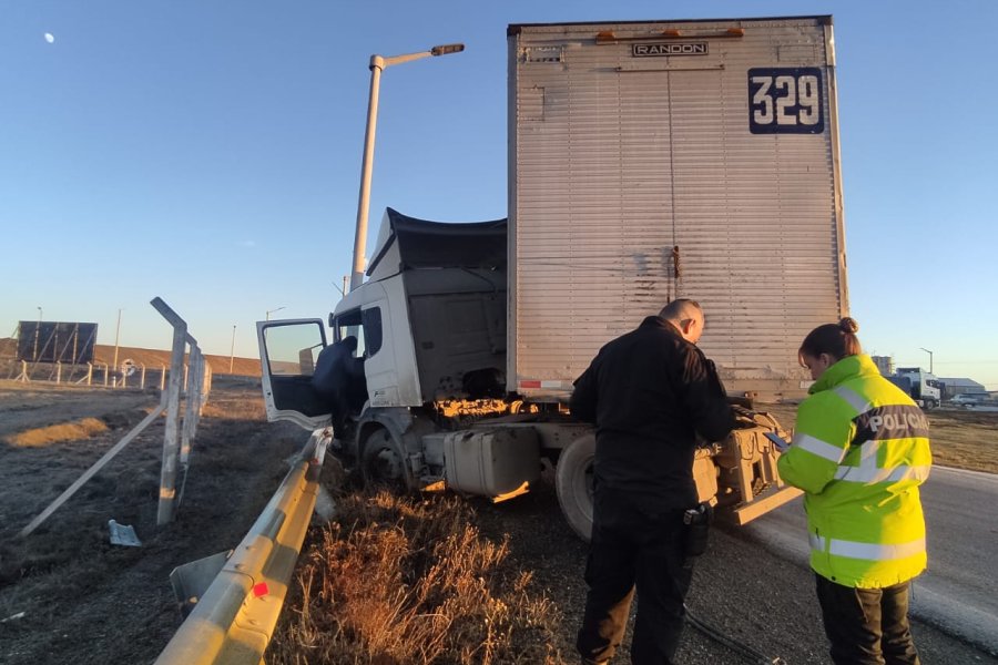 Ocurrió recientemente en la zona de Campamento YPF con un camión Scania P340 que se desplazaba desde circunvalación hacia la ruta 3. El camión de la empresa Cantarini circulaba en dirección norte cuando se salió de la carretera debido a la escarcha presente en el pavimento y finalmente colisionó contra la barrera de protección de la rotonda.