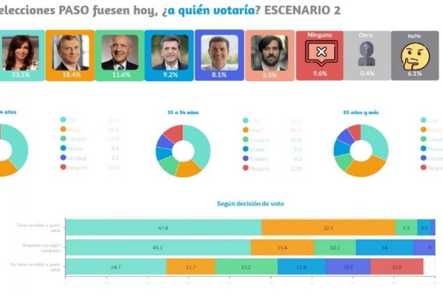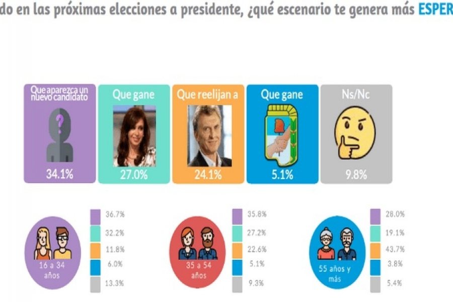 Ahora bien, ante la pregunta \"Pensando en las próximas elecciones a presidente, ¿qué escenario te genera más esperanza?\", la opción más elegida, con el 34,1%, fue \"que aparezca un nuevo candidato\".