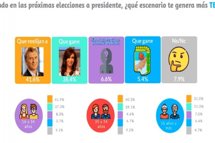\"Pensando en las próximas elecciones a presidente, ¿qué escenario te genera más temor?\" es otra de las preguntas que incluye el estudio que tiene un error muestral de (+/-) 3.2%. Ante este planteo, un 41,6% se inclinó por la opción \"que reelijan a Macri\",y un 38,4% optó por \"que gane CFK\".