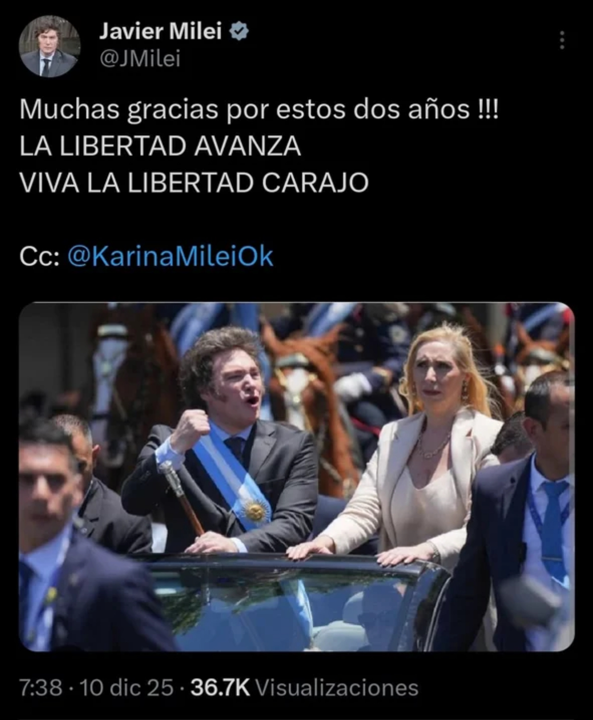 El presidente Javier Milei cumplió este miércoles dos años de gestión y lo celebró en su cuenta de X: “Muchas gracias”.