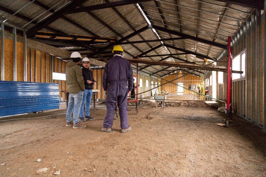 En el hall de acceso se realizó la provisión y colocación de paredes portante y se preparó la cabriada metálica para recibir techo. También se realiza la colocación y preparación de perfilería para realizar el revestimiento exterior.