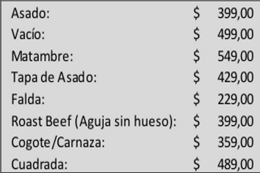 Los cortes y los precios disponibles:
