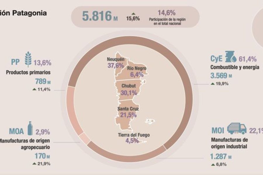 En la distribución provincial, Neuquén encabezó las ventas externas con el 37,6% del total patagónico, seguido por Chubut (30,1%), Santa Cruz (21,5%), Río Negro (6,4%) y Tierra del Fuego (4,5%).