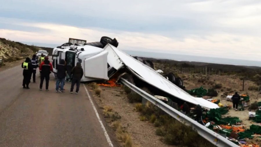 Un camión que se dirigía a Río Grande, Tierra del Fuego, volcó el martes por la noche en la Ruta Nacional Nº 3, a unos 34 kilómetros al sur de Caleta Olivia, luego de perder el control por la descalzadura de un neumático. La unidad transportaba frutas y hortalizas desde la ciudad de Cipolletti, en Río Negro, con destino a comercios fueguinos.