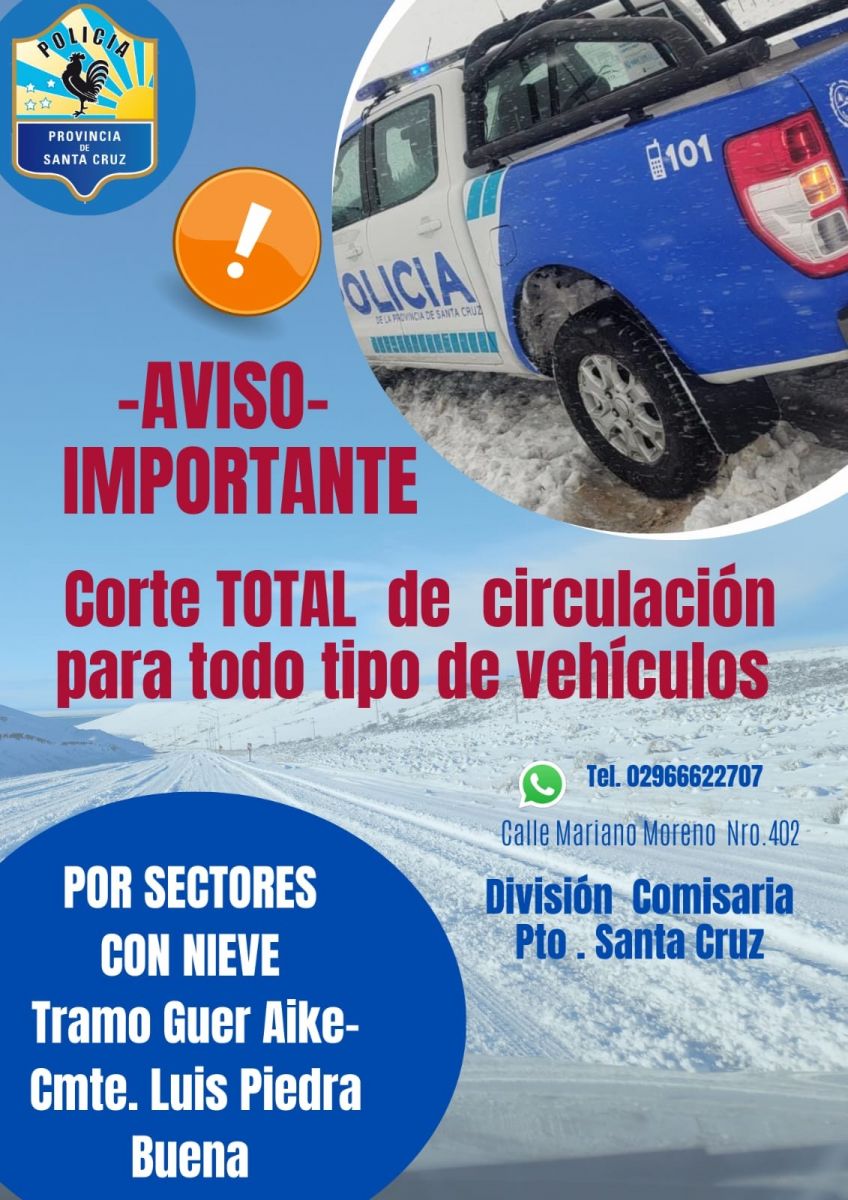 Pero, hace unos minutos, desde la policía se informó que la Ruta Nacional N°3, en el tramo Güer Aike hasta la localidad de Piedra Buena se encuentra cortado totalmente la circulación para todo tipo de vehículos, ya que hay sectores con nieve, en ese tramo de la ruta.