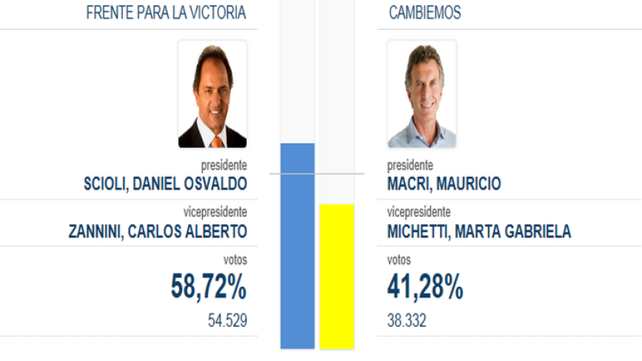 Scioli obtuvo 54.529 votos (58,72%) contra 38.332 votos obtenidos por Mauricio (41,28%) Macri del PRO.