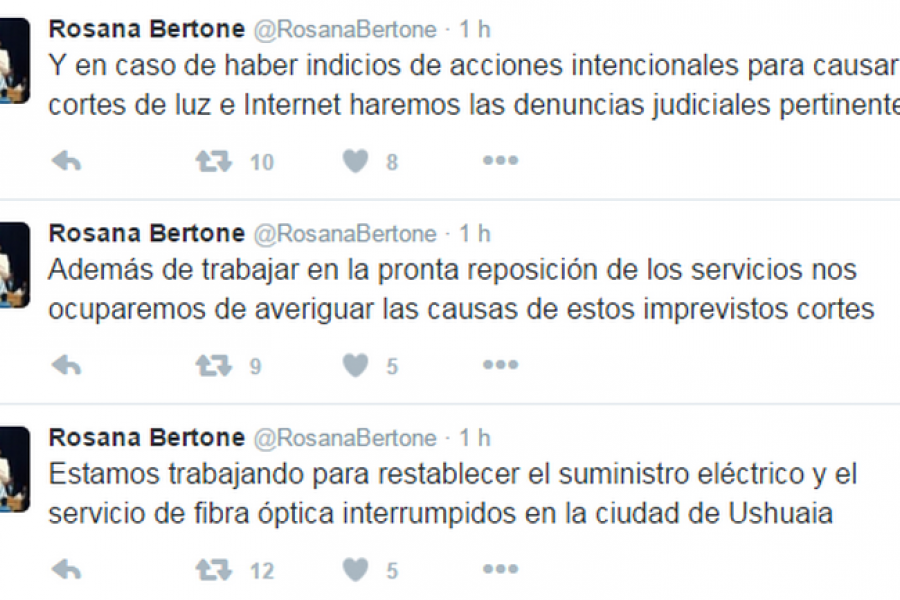En ese sentido la gobernadora Rosana Bertone dio instrucciones para que la Dirección Provincial Energía informe detalladamente las causas de los cortes. En el marco de las medidas de acción directa de los sindicato Regional y Austral de Luz y Fuerza, el Ministerio de Trabajo dictó la conciliación obligatoria a través de la resolución 006/16.