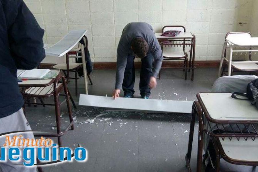 El directivo informó que ”el plafón de una estructura de casi dos metros de anchos se encontraba colgados de un techo de durlock. Luego de que esto se cayera evacuamos rápidamente el aula, y se hizo presente obras públicas, quienes encontraron tres plafones más sueltos”.