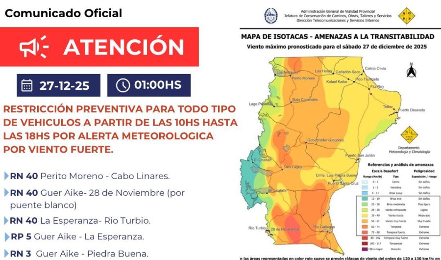 La medida rige este sábado 27 de diciembre, en el horario comprendido entre las 10:00 y las 18:00 horas, y fue adoptada en base a la información emitida por el Servicio Meteorológico Nacional y al mapa de riesgo de transitabilidad elaborado por la Vialidad Provincial de Santa Cruz.