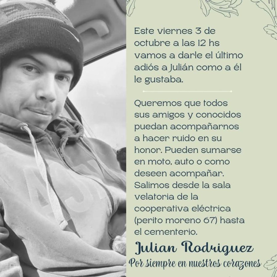 El cortejo partirá este viernes 3 de octubre a las 12 horas desde la sala velatoria de la Cooperativa Eléctrica, ubicada en Perito Moreno 67, y se dirigirá hacia el cementerio. Se invita a amigos y conocidos a sumarse en moto, auto o como deseen, ofreciendo así su apoyo a la familia en este momento de duelo.