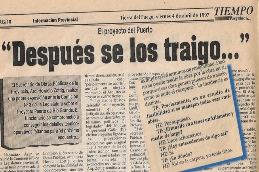 Los debates que sobrevendrían en sede del nada honorable (por entonces) Parlamento provincial, dejarían al desnudo (más temprano que tarde) la mentira: la obra no estaba basada en proyecto alguno, se presentó una maqueta con barquitos flotando en un mar de celofán y jamás una carpeta técnica más o menos convincente. “Multipropósito”, zafaban los funcionarios como letanía mal aprendida, cuando les preguntaban qué tipo de puerto tenían pensado para Río Grande.
