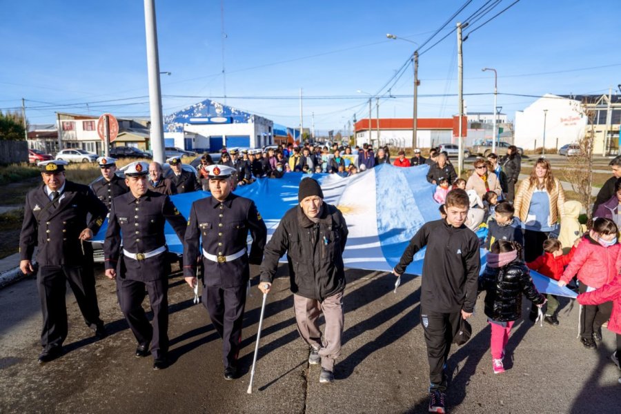 La propuesta comenzó con una caminata por las calles de la manzana y el despliegue de una bandera de 25 metros y terminó en las instalaciones del Colegio Comandante Luis Piedrabuena, donde se dijeron palabras alusivas, repartieron escarapelas confeccionadas por las personas del Hogar de Día y, finalmente, se compartió chocolatada provista por el BIM N°5.