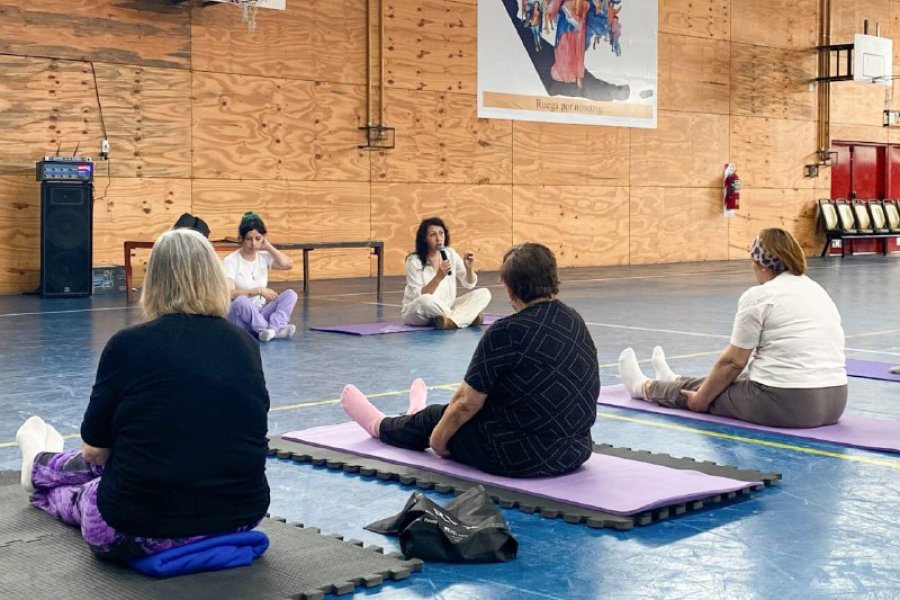 El encuentro incluyó un espacio de preguntas e intercambio de experiencias, y culminó con una práctica de yoga guiada por la instructora Cynthia Oyarzo, centrada en la respiración consciente y ejercicios articulares.