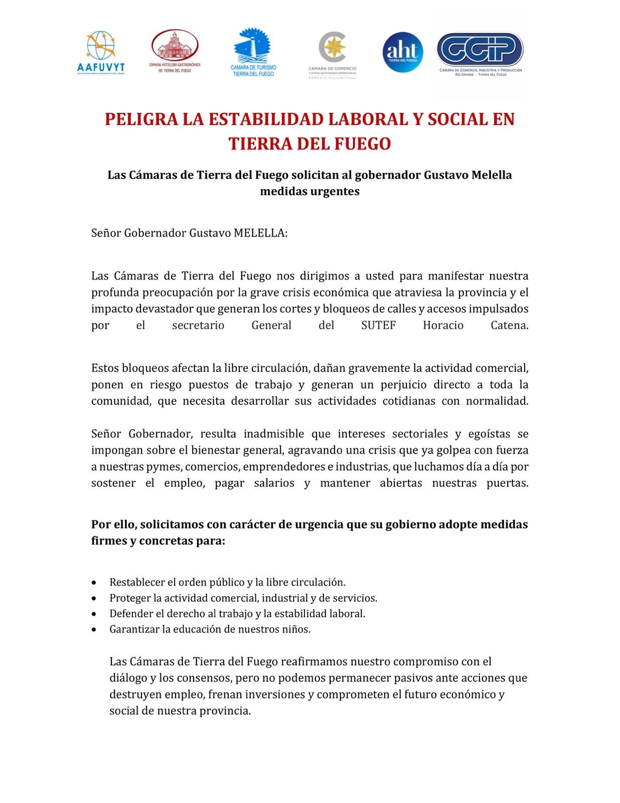 Las cámaras emplazaron al mandatario fueguino a restablecer el orden público y la libre circulación en el territorio. También pidieron medidas que protejan el derecho al trabajo, la estabilidad laboral y la continuidad de la educación, asegurando que sin una reacción inmediata del Ejecutivo, la situación podría agravarse aún más.